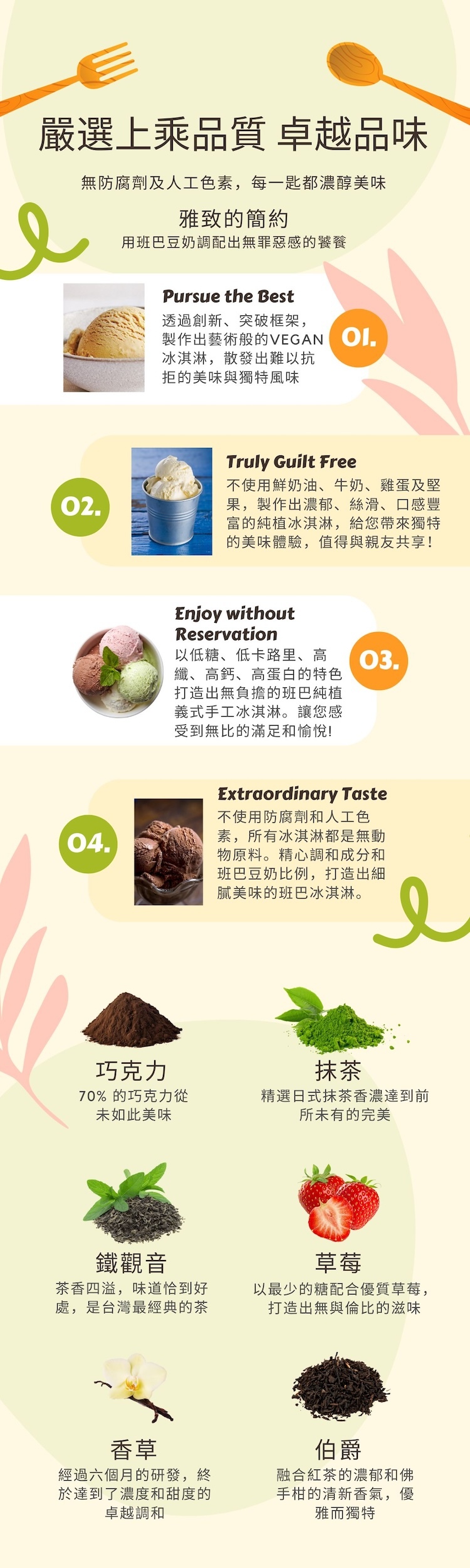 與市面上其他甜點不同,班巴素義式冰淇淋以天然低糖的班巴豆奶為基底,是追求健康生活的您與孩子們的最佳甜點選擇。無需擔心過高的糖分,只需盡情享受每一口的純植美味。
